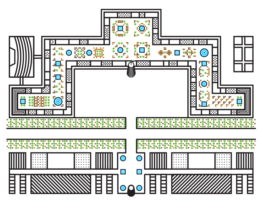 Le palais sociétaire a été dessiné à partir de Description du phalanstère et considérations sociales sur l’architectonique, Victor Considérant, Paris, librairie sociétaire, 1848. L’espace environnant est dupliqué pour susciter une autre dimension, à voir comme un lieu parfait ou imaginaire, un mirage symétrique ou un tapis persan…